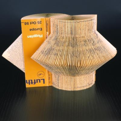 Description: Once around the world … Folded books can't become a terrestrial globe, but one can almost see a Lufthansa airplane flying around this symbol of our planet. The coloured backside reminds us of mother earth, manifold and multifaceted.